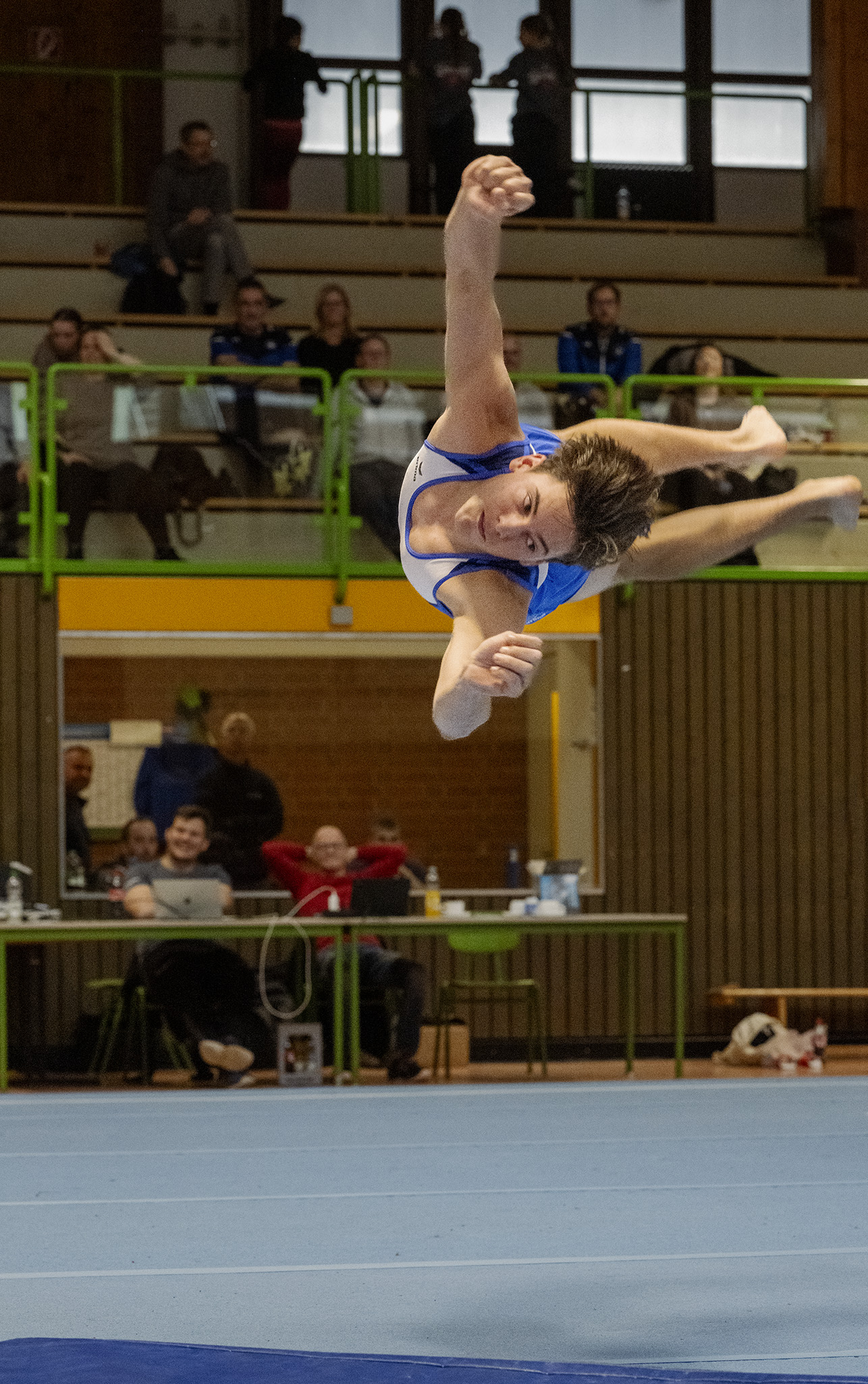 Am Boden startete das Team dann endgültig durch. Jakob Zahn turnte erstmals seine Übung mit Doppelsalto rückwärts und wurde mit 13,2 Punkten und damit der zweitbesten Wertung der Landesliga belohnt. Aaron Bondoc ergänzte das Ergebnis durch eine fast abzugsfreie Übung mit 12,6 Punkten und setzte so ein klares Ausrufezeichen. Als letzter Turner der Mannschaft an diesem Gerät gelang Arvid Hartwig dann, mit gerade einmal zwölf Jahren, ein perfektes Debüt auf großer Wettkampfbühne. Auch dieses Gerät konnte deutlich gewonnen werden.