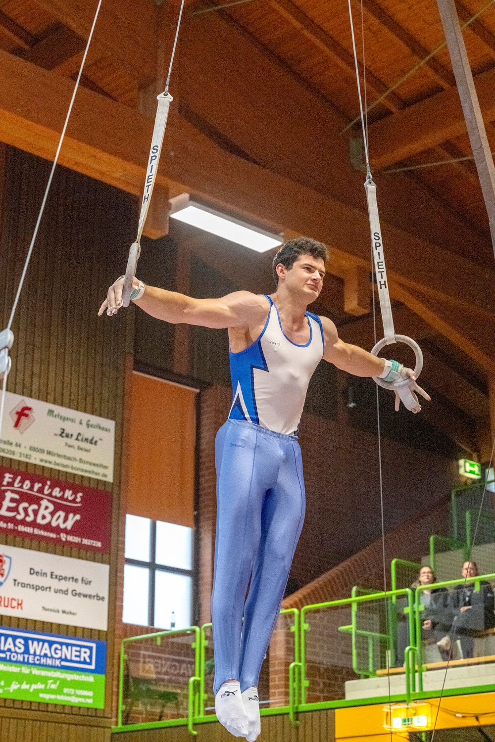 Die Ringe, die sich wohl vor allem durch den Ringe-Spezialisten Patrick Helwer im vergangenen Jahr zu einem weiteren Paradegerät entwickelt hatten, wurden mit einem schon ausgebauten Punktevorsprung mit Freude erwartet. Ben Fiedler zeigte eine Übung mit neuer Schwierigkeit und wurde mit 10,6 Punkten belohnt. Auch Steffen Lippke zeigte durch den neuen Kreuzhang eine äußerst schwere Übung und erreichte ganze 11,35 Punkte. Als letzter Turner des Wettkamps ging dann Patrick Helwer an den Start. Die Zuschauer und Turner hatten sich zu diesem Zeitpunkt bereits am Gerät versammelt, um sich die Übung nicht entgehen zu lassen. Mit einer Schwalbe, einem Nakayama und insgesamt vier unterschiedlichen Kreuzhängen gelang ihm dann der grandiose Abschluss. Er wurde mit ganzen 14,6 Punkten und damit der Tageshöchstwertung belohnt. Dadurch war der Jubel groß und die Turner der KTV Main-Kinzig entschieden den ersten Landesliga-Wettkampf mit 199,05 Punkten klar für sich.