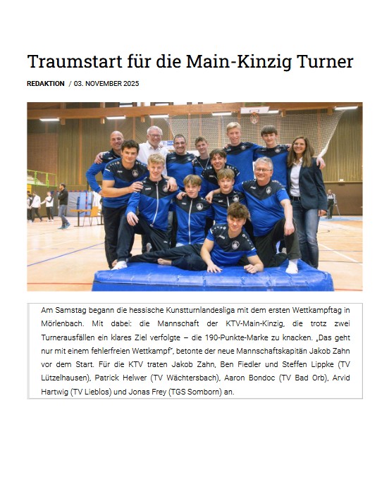 Am Samstag begann die hessische Kunstturnlandesliga mit dem ersten Wettkampftag in Mörlenbach. Mit dabei: die Mannschaft der KTV-Main-Kinzig, die trotz zwei Turnerausfällen ein klares Ziel verfolgte – die 190-Punkte-Marke zu knacken. „Das geht nur mit einem fehlerfreien Wettkampf“, betonte der neue Mannschaftskapitän Jakob Zahn vor dem Start. Für die KTV traten Jakob Zahn, Ben Fiedler und Steffen Lippke (TV Lützelhausen), Patrick Helwer (TV Wächtersbach), Aaron Bondoc (TV Bad Orb), Arvid Hartwig (TV Lieblos) und Jonas Frey (TGS Somborn) an.